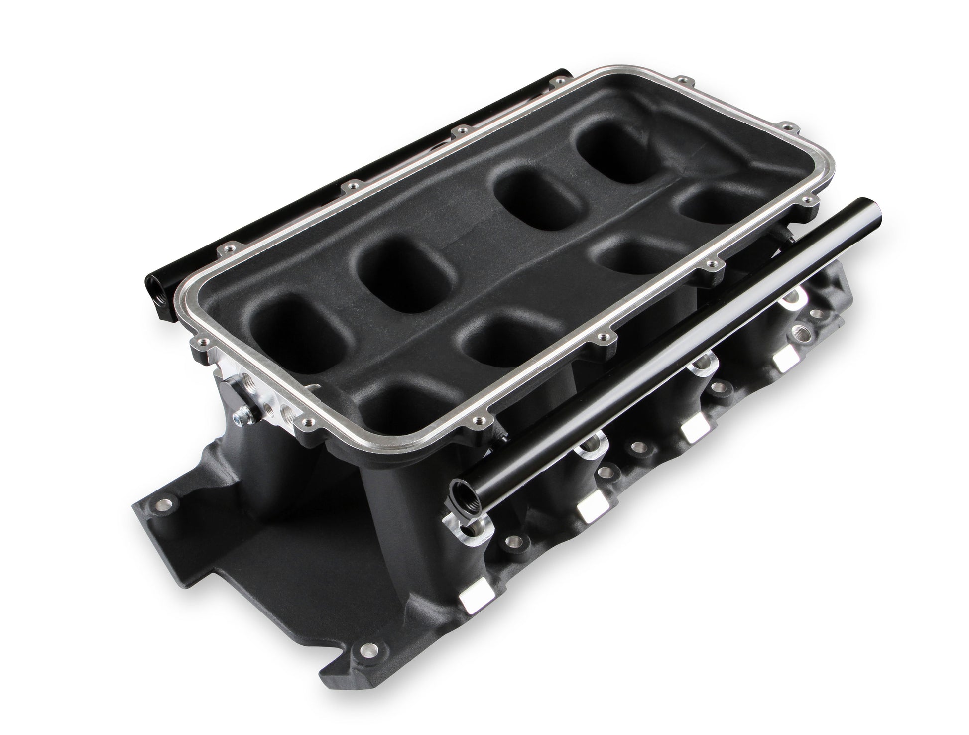 HOLLEY EFI 8.2 DECK SBF FORD HI-RAM EFI MANIFOLD WITH SIDE MOUNT TOP-BLACK with 105mm 1986-95 Ford 5.0 Throttle Body Flange